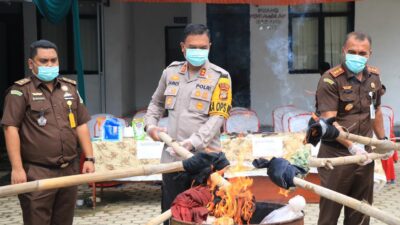 “Hari ini, saya bersama PJU Polres dan Kapolsek jajaran menghadiri kegiatan pemusnahan BB yang telah berkekuatan hukum tetap (inkracht) pada Kejaksaan Negeri Tulang Bawang. Kegiatan tersebut berlangsung di lapangan Pengadilan Negeri Menggala,” ujar AKBP James.
