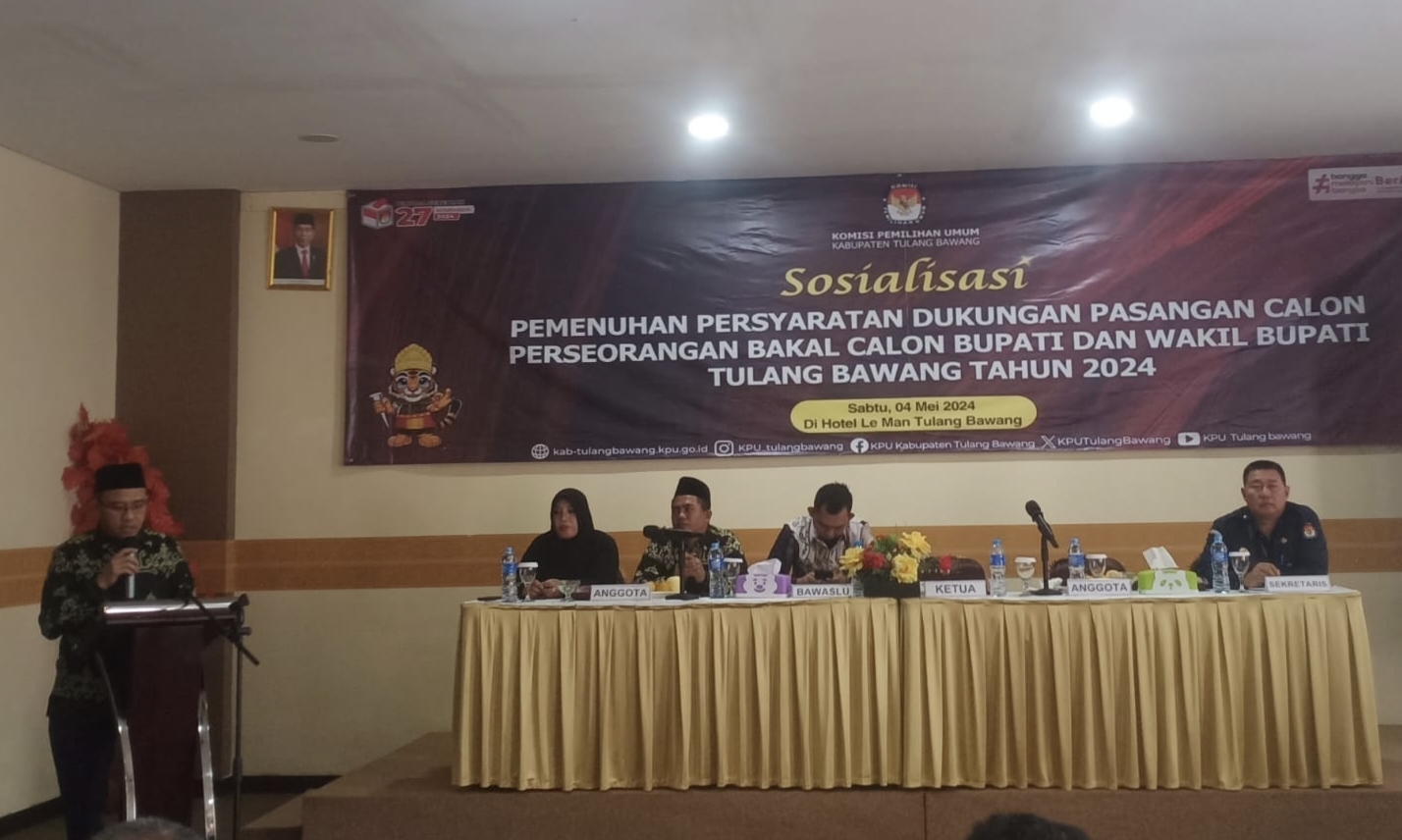 Harianposlampung – Komisi Pemilihan Umum (KPU) Kabupaten Tulang Bawang, menyelenggarakan sosialisasi pemenuhan persyaratan dukungan pasangan calon perseorangan bakal calon bupati dan wakil bupati Tulang Bawang Tahun 2024, di Hotel Le Man Unit II Tuba. Sabtu (4/5/2024)