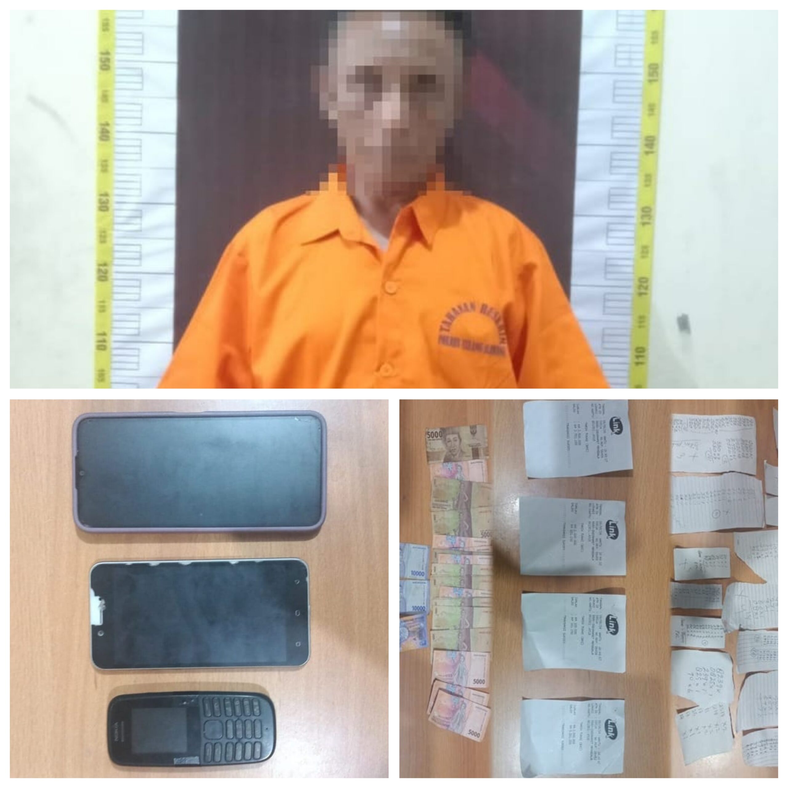 Lanjutnya, adapun barang bukti (BB) yang disita oleh petugas kami dari tangan bandar judi togel tersebut berupa uang tunai sebesar Rp 175.000,- (seratus tujuh puluh lima ribu rupiah), 25 lembar kompelan kertas pemasang nomor togel, 4 lembar kertas penarikan uang di ATM BRI, satu bendel kertas kosong untuk kompelan pemasangan nomor togel, handphone (HP) merek Nokia 105 warna hitam, HP merek Oppo warna gold, dan HP merek Vivo Y20 warna biru.