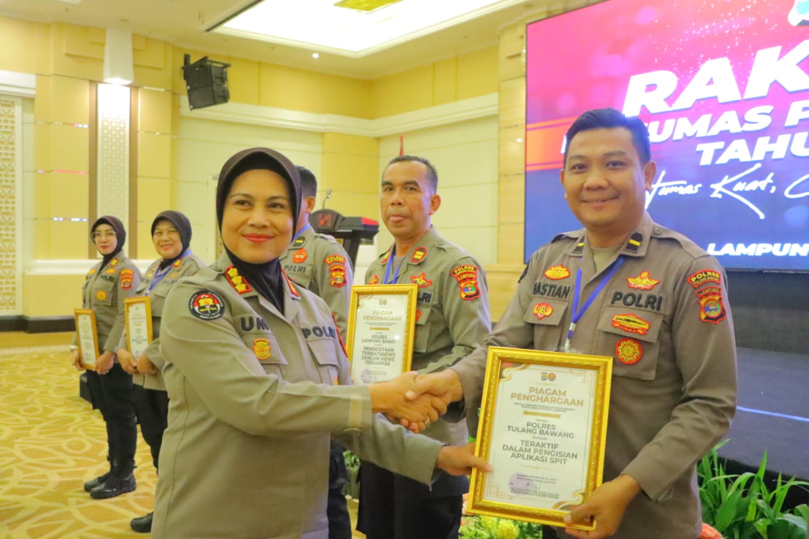 Ada 6 (enam) Polres yang menerima reward (penghargaan) yang diberikan langsung oleh Kabid Humas Polda Lampung, Kombes Pol Umi Fadilah Astutik, S.Sos, SIK, M.Si, pada kegiatan rakernis 2024 kali ini, salah satunya Polres Tulang Bawang.