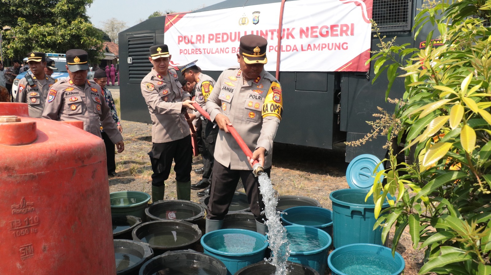“Hari ini, kami menggelar kegiatan Polri Peduli Untuk Negeri dengan mendistribusikan 19.000 (sembilan belas ribu) liter air bersih kepada masyarakat terdampak kemarau di dua lokasi berbeda yakni di Lingkungan Bugis, Kelurahan Menggala Kota dan Kampung Bujuk Agung, Kecamatan Banjar Margo,” kata Kapolres Tulang Bawang, AKBP James H Hutajulu, SIK, SH, MH, MIK.
