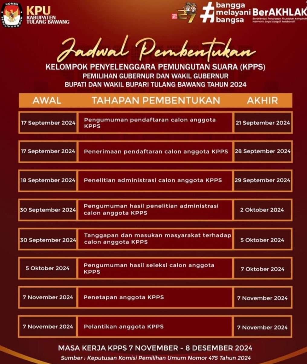 Dilansir dari medsos Facebook Jumat, (13/09/2024) Komisi Pemilihan Umum Daerah ( KPUD) Kabupaten Tulang bawang membuka perekrutan badan adhoc Kelompok Penyelengara pemungutan Suara ( KPPS ) .