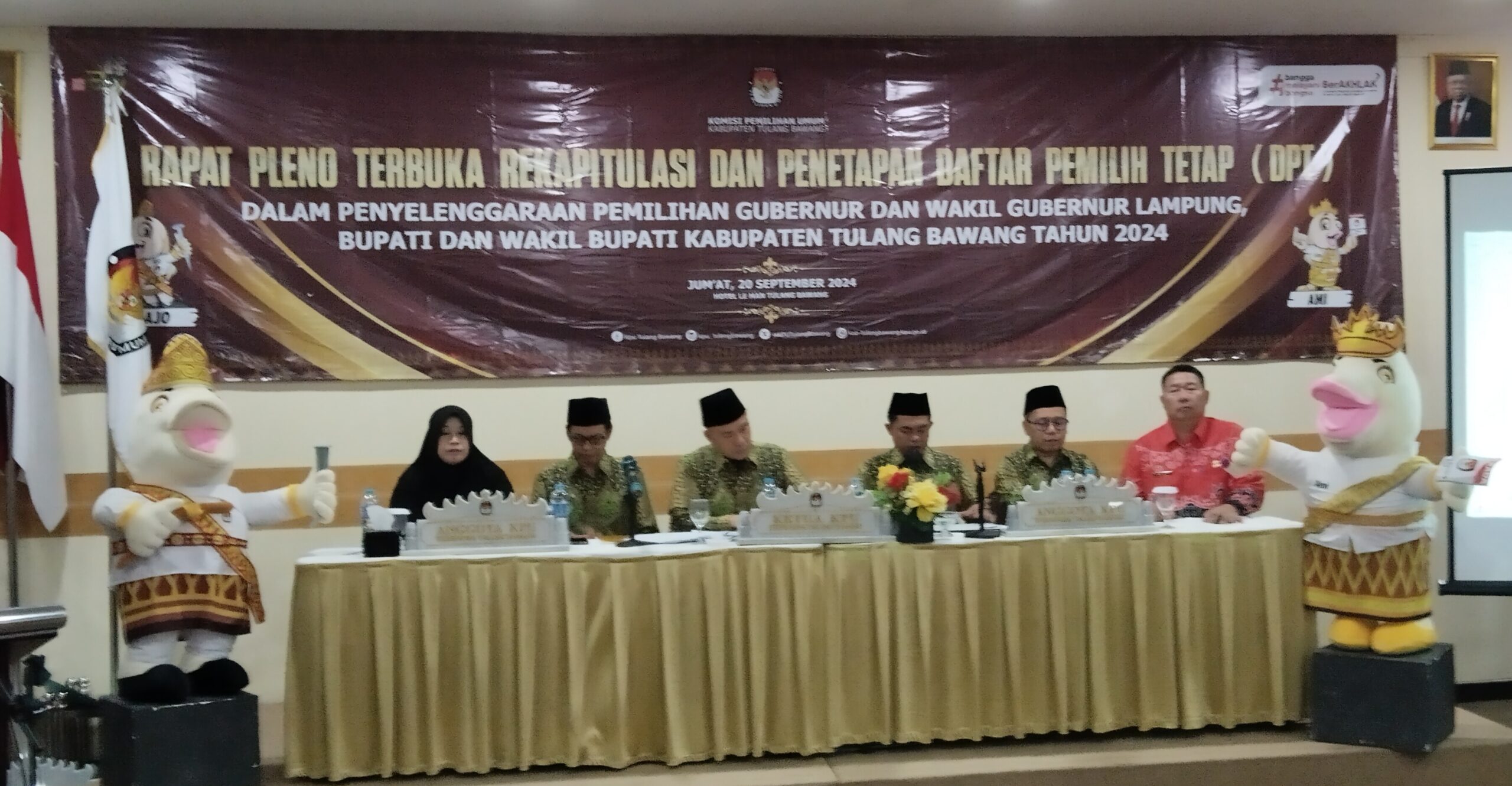 Tulangbawang, Harianposlampung.com – Komisi Pemilihan Umum (KPU) Tulang Bawang menggelar kegiatan Rapat Pleno Terbuka Rekapitulasi dan Penetapan Daftar Pemilih Tetap (DPT) di Aula Hotel Lee- Man Unit ll Tulang bawang, Jumat 20/09/2024