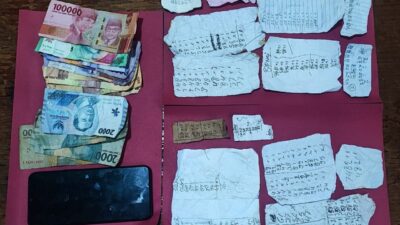 “Saat petugas kami bertemu dengan pelaku, langsung dilakukan penangkapan dan penggeledahan badan, serta disita BB berupa HP, uang tunai dan rekapan judi togel,” papar perwira dengan balok kuning dua dipundaknya.