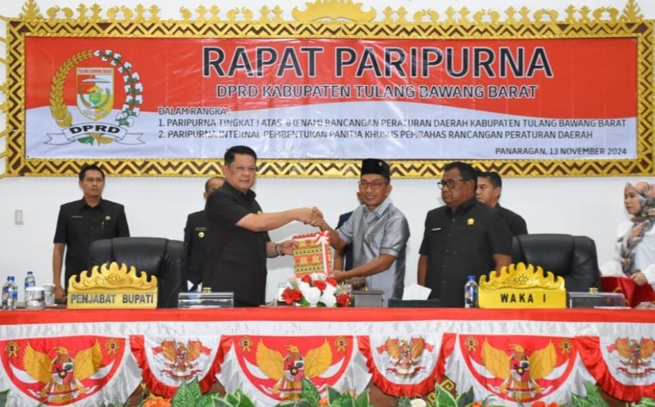 Tulangbawang Barat,Harianposlampung.com – Penjabat (Pj) Bupati Tulang Bawang Barat (Tubaba) Drs. M. Firsada, M.Si., sampaikan 3 Rancangan Peraturan Daerah (Raperda) Inisiatif DPRD dan 3 Raperda Kabupaten Tubaba pada Rapat Paripurna DPRD Pembicaraan Tingkat I atas 6 Raperda Kabupaten Tubaba. Di Ruang Paripurna DPRD setempat. Rabu 13 November 2024
