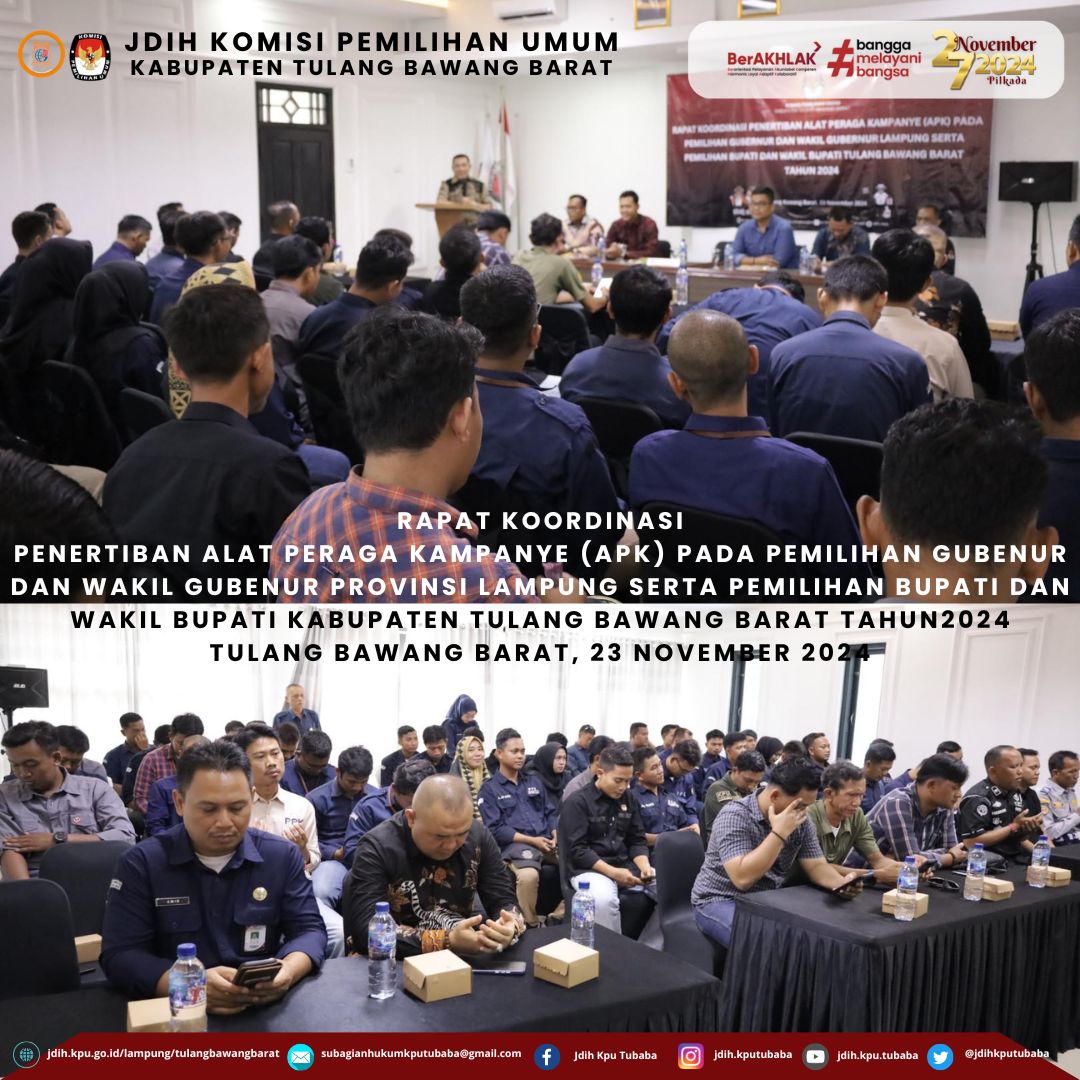 Tulangbawang Barat, Harianposlampung.com – Komisi Pemilihan Umum Kabupaten Tulang Bawang Barat melaksanakan Rapat Koordinasi Penertiban Alat Peraga Kampanye (APK) pada Pemilihan Gubenur dan Wakil Gubenur Provinsi Lampung serta pemilihan Bupati dan Wakil Bupati Kabupaten Tulang Bawang Barat Tahun 2024,Sabtu (23 November 2024), di Wisma Jasa Prima Kabupaten Tulang Bawang Barat.