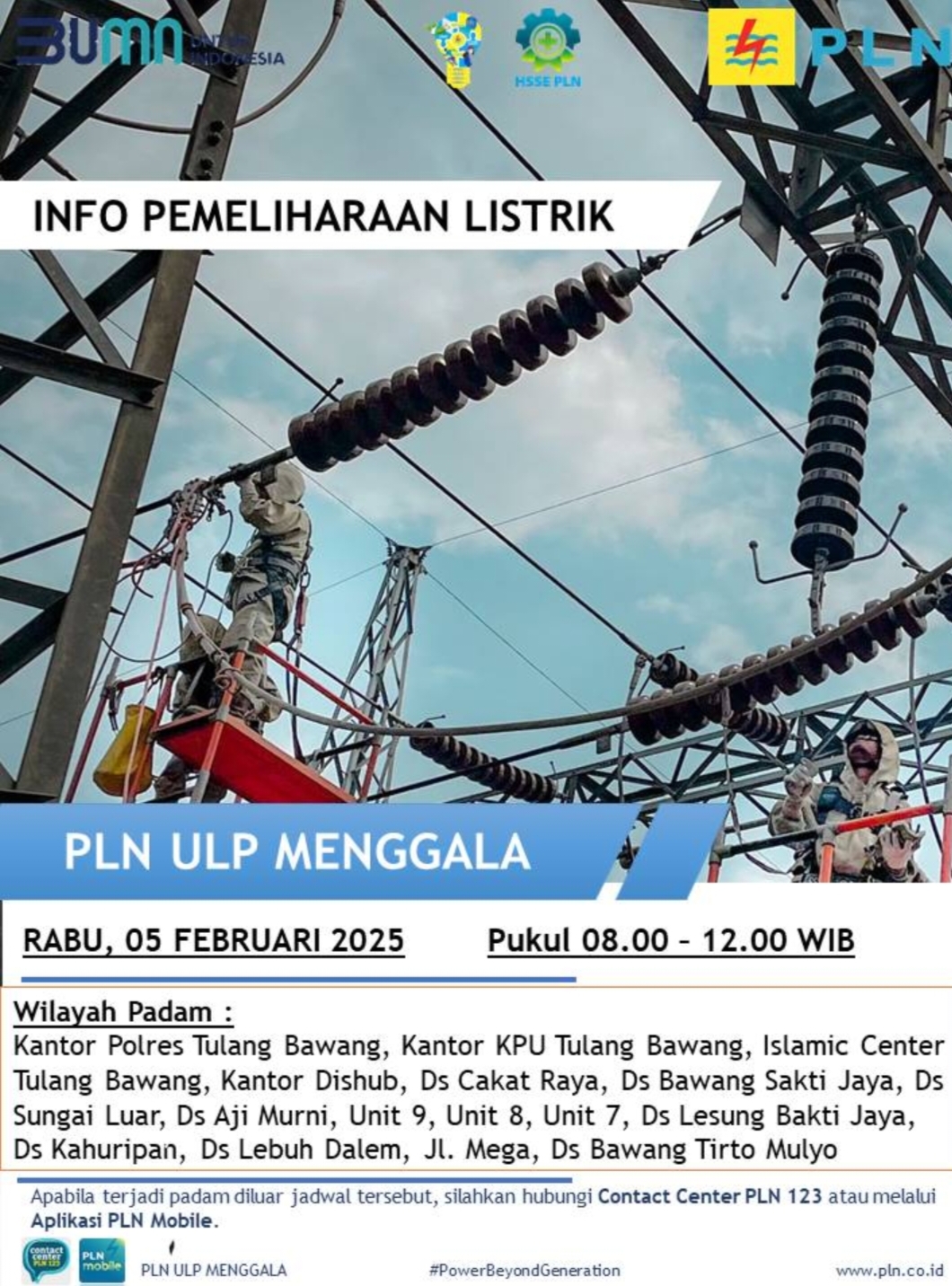 Tulangbawang, Harianposlampung.com – Perusahaan Listrik Negara (PLN) ULP Menggala Kabupaten Tulang bawang akan melakukan pemadaman aliran listrik di beberapa wilayah Tulang bawang hal itu dikarenakan adanya kegiatan pemeliharaan listrik pada Rabu, 5 Februari 2025