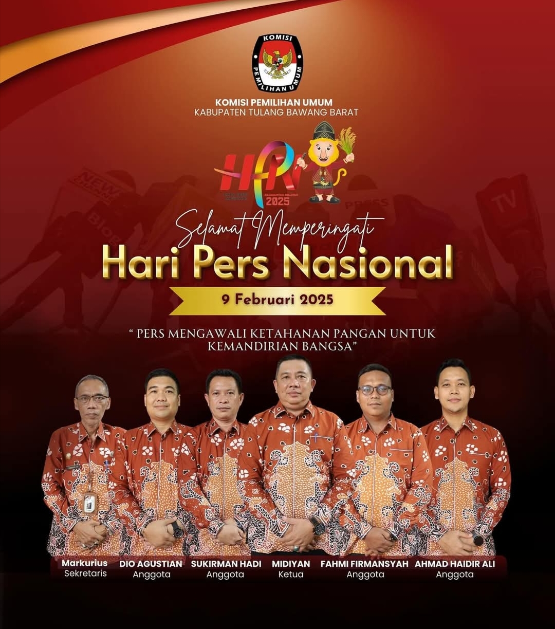 Tulangbawang Barat, Harianposlampung.com – Ketua KPU Tulang Bawang Barat beserta Komisioner Mengucapkan Selamat Hari Pers Nasional (HPN) Tahun 2025 Denga Tema “Pers Mengawali ketahanan pangan untuk kandirian Bangsa”