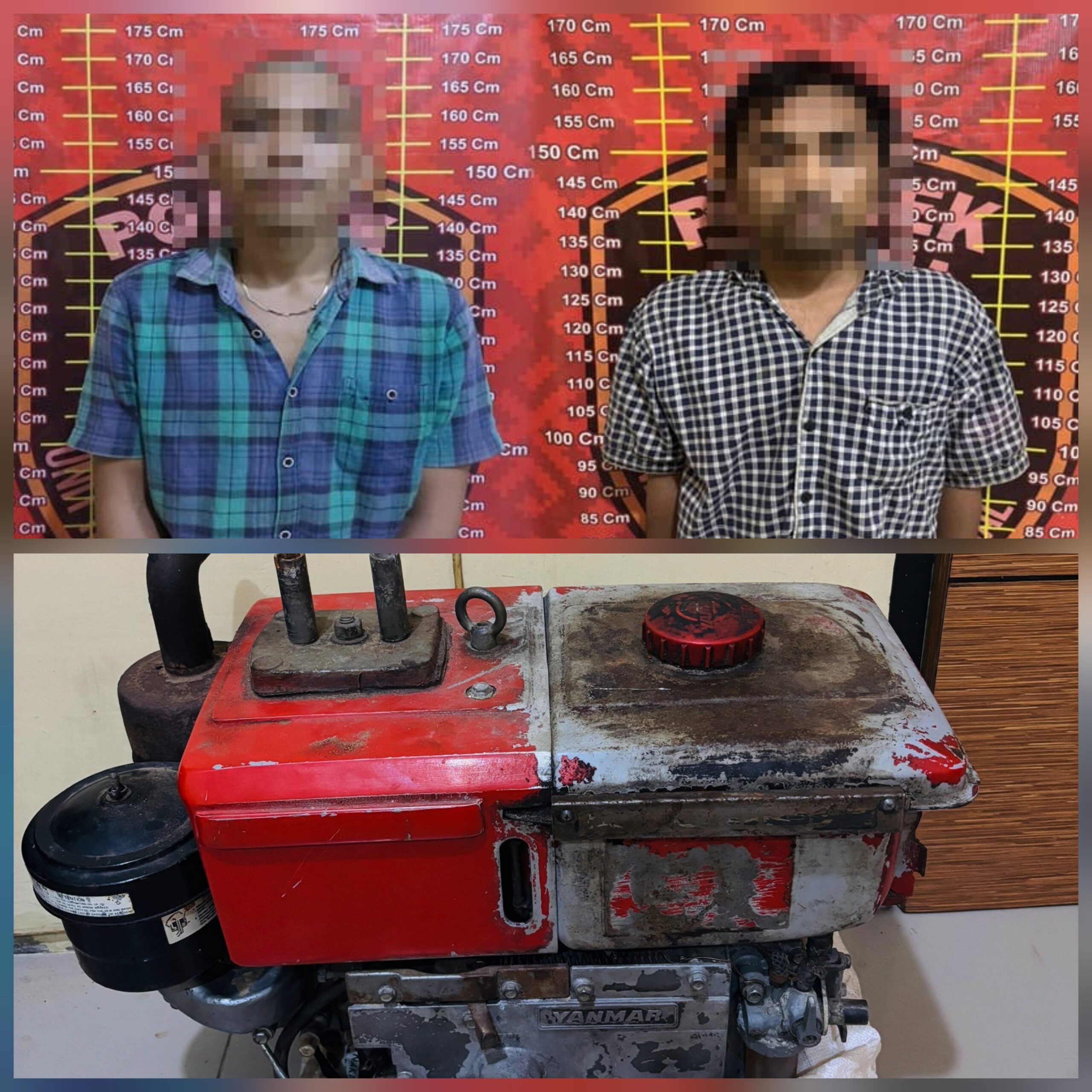 Selain menangkap dua orang pelaku curat, petugas gabungan juga menyita barang bukti (BB) berupa mesin diesel ukuran 8 (delapan) PK warna merah merek Yanmar yang digunakan untuk menyedot air di areal perkebunan timun dan cabe.