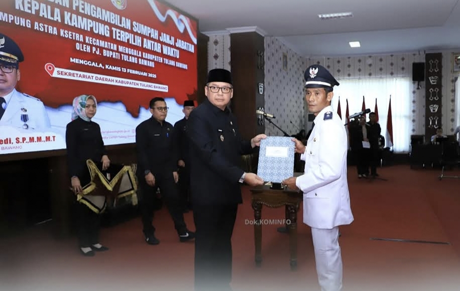 Tulangbawang,Harianposlampung.com – Pj Bupati Tulang Bawang Ir. Ferli Yuledi.,SP.,MM.,MT Melantik Secara Langsung Kepala Kampung Terpilih Antar Waktu Kampung Astra Ksetra Kecamatan Menggala.