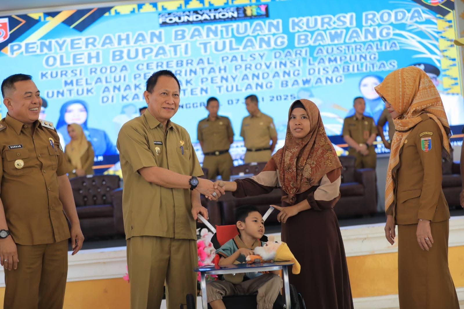 Tulangbawang,Harianposlampung.com – Pada hari senin tangga lagu 7 Juli 2025 Pemerintah Kabupaten Tulang Bawang kembali menunjukkan komitmen nyata terhadap pemenuhan hak penyandang disabilitas dengan menyalurkan 40 unit kursi roda kepada anak-anak pengidap cerebral palsy. Penyerahan dilakukan dalam kegiatan resmi yang berlangsung di Gedung Serba Guna (GSG) Menggala.