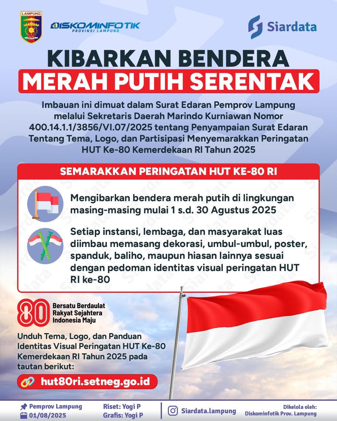 Bandarlampung,Harianposlampung.com – Pemprov Lampung melalui Sekretaris Daerah Marindo Kurniawan mengeluarkan Surat Edaran Nomor 400.14.1.1/3856/VI.07/2025 tentang Penyampaian Surat Edaran Tentang Tema, Logo, dan Partisipasi Menyemarakkan Peringatan HUT Ke-80 Kemerdekaan Rl Tahun 2025.