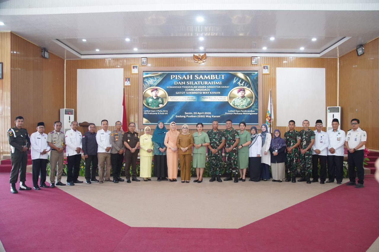 Way Kanan, Harianposlampung.com – Pemerintah Kabupaten Way Kanan menggelar Acara Pisah Sambut dan Silaturahmi Komandan Lanudad Gatot Soebroto Way Tuba di Gedung Pusiban Pemkab Way Kanan, Senin (20/04/2026).
